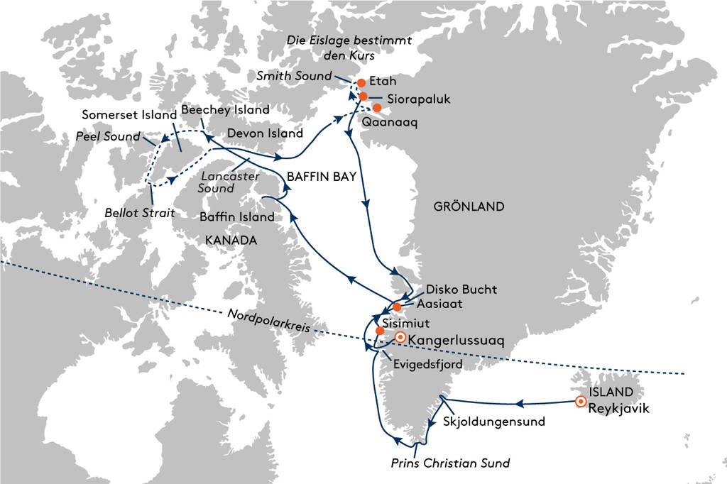 Die Fahrt durch die Baffin Bay ließ ihren Namensgeber, den englischen Entdecker William Baffin, lebendig werden. Er suchte hier im 17. Jahrhundert vergeblich nach der Nordwestpassage.