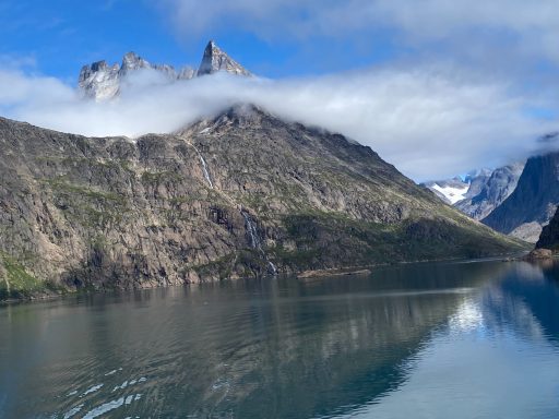 Die Südostküste Grönlands empfing uns rau und erhaben. Im Skjoldungensund ragten zerklüftete Berge steil aus dem Meer, Nebelschwaden zogen wie lebendige Wesen durch die Täler. Eisberge trieben lautlos vorbei – blau schimmernde Kathedralen aus uraltem Gletschereis.