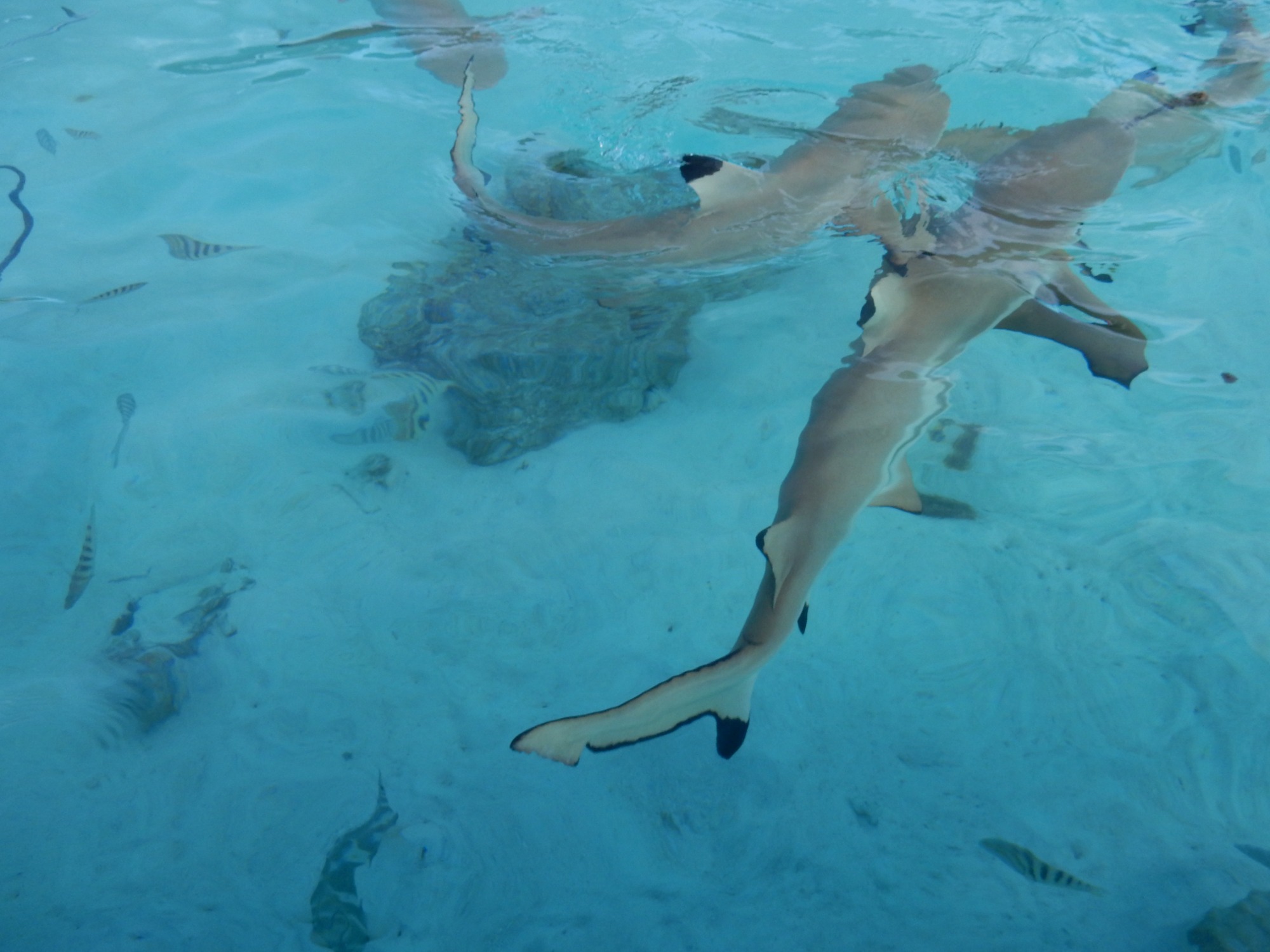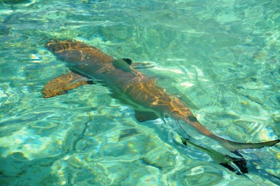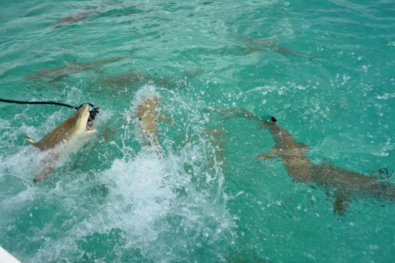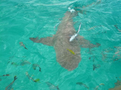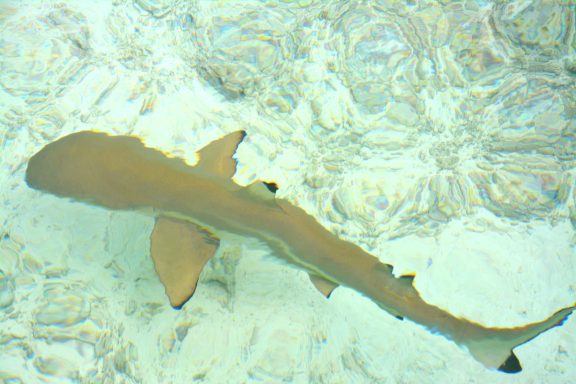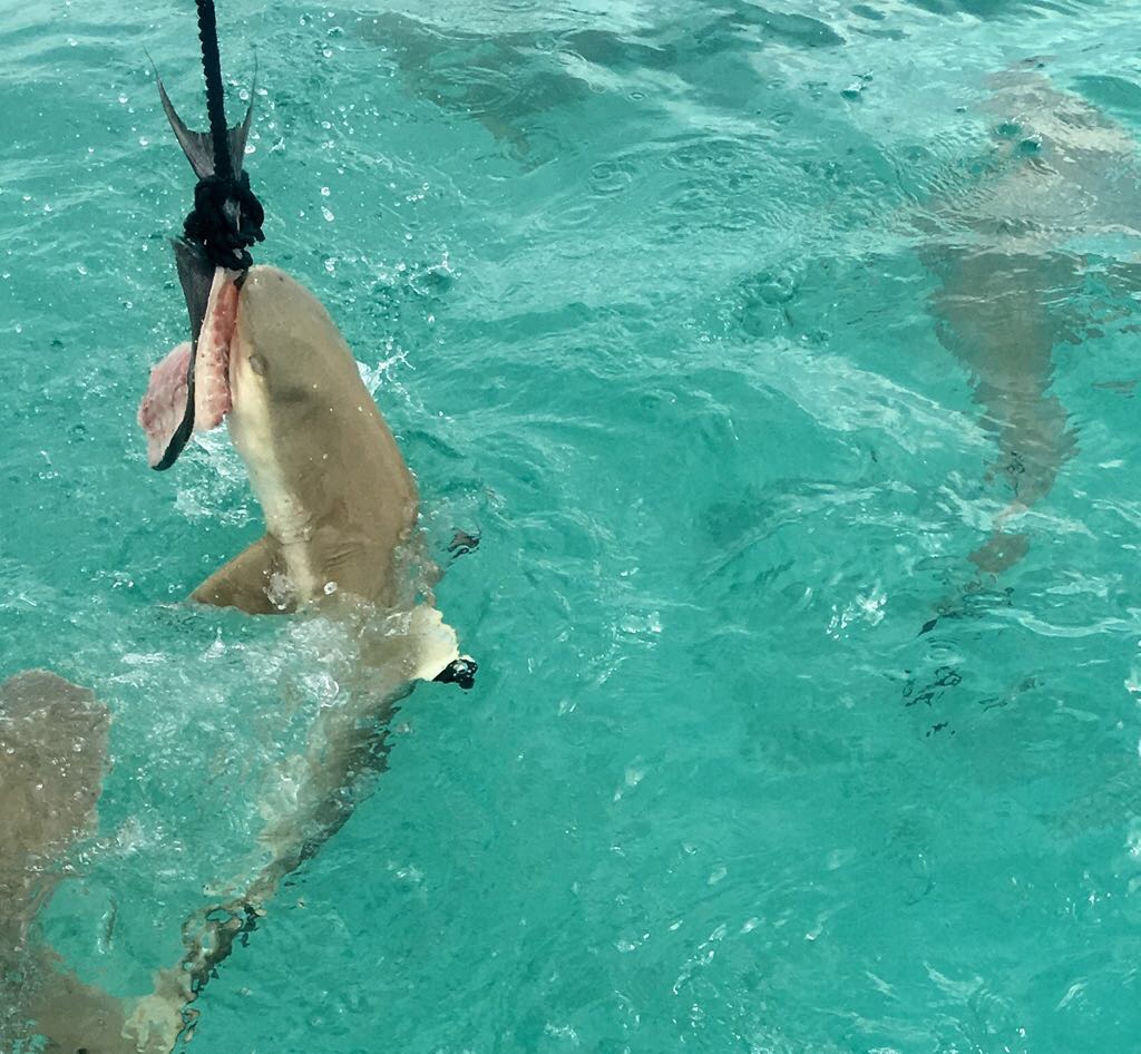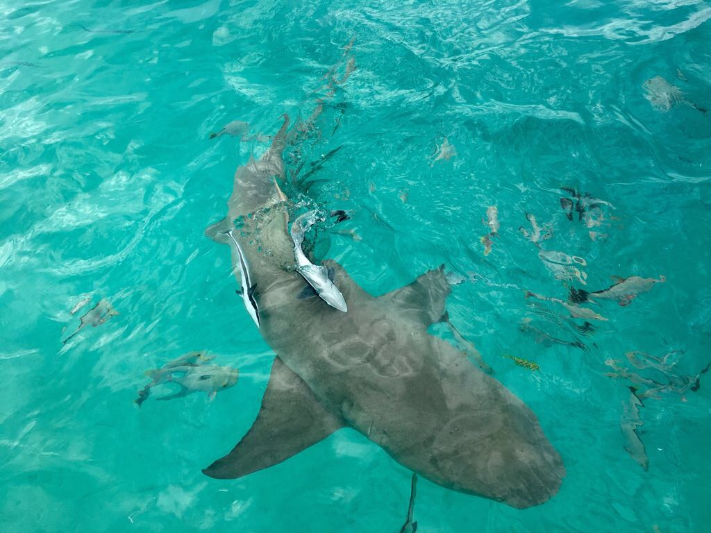 Unser erster Ausflug führt uns in die berühmte „Lagune in der Lagune“ – die Blaue Lagune, eine kleine, von Palmen eingerahmte Lagune innerhalb der großen Lagune von Rangiroa. Das Wasser ist kristallklar, und direkt beim Einstieg vom flachen Sandboden erleben wir junge Schwarzspitzen-Riffhaie. Sie sind ungefährlich, doch wenn man mitten in einen Schwarm hineinschwimmt oder wie in einer Badewanne für Haie hineingeht, kribbelt es schon ordentlich. Begleitet werden wir von bunten Fischen, kleinen Rochen und farbenprächtigen Korallen – ein idyllisches Schnorchelparadies, dass man so schnell nicht vergisst. Vom Boot aus erspähen wir auch größere Haie, wie den mächtigen Zitronenhai. Als er mit rund 3,5 m Länge direkt auf mich zu schwimmt, zieht es mich instinktiv zurück aufs Boot – ein Herzklopfen-Moment, der die Wildheit des Ozeans spürbar macht.