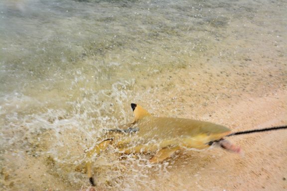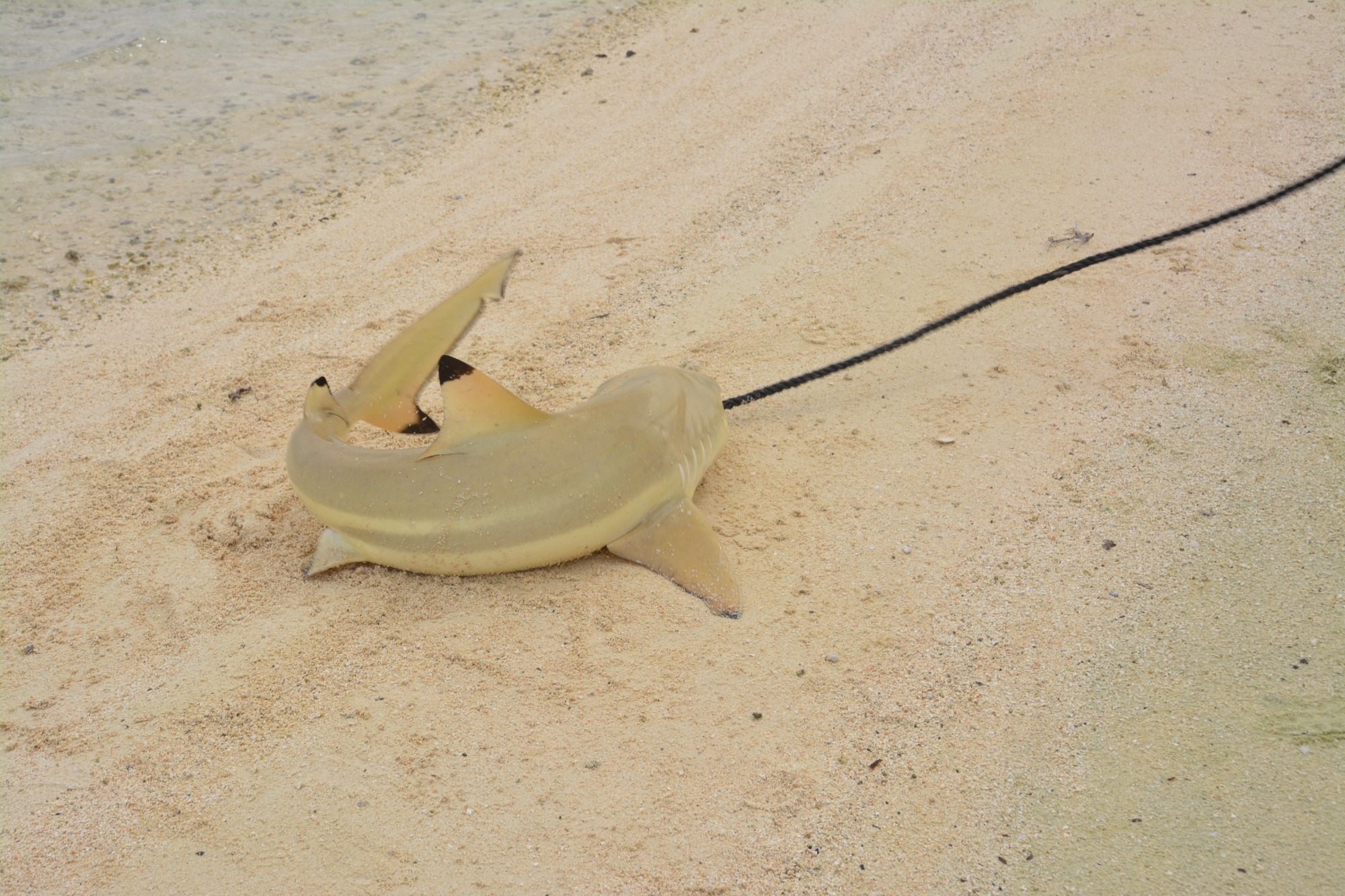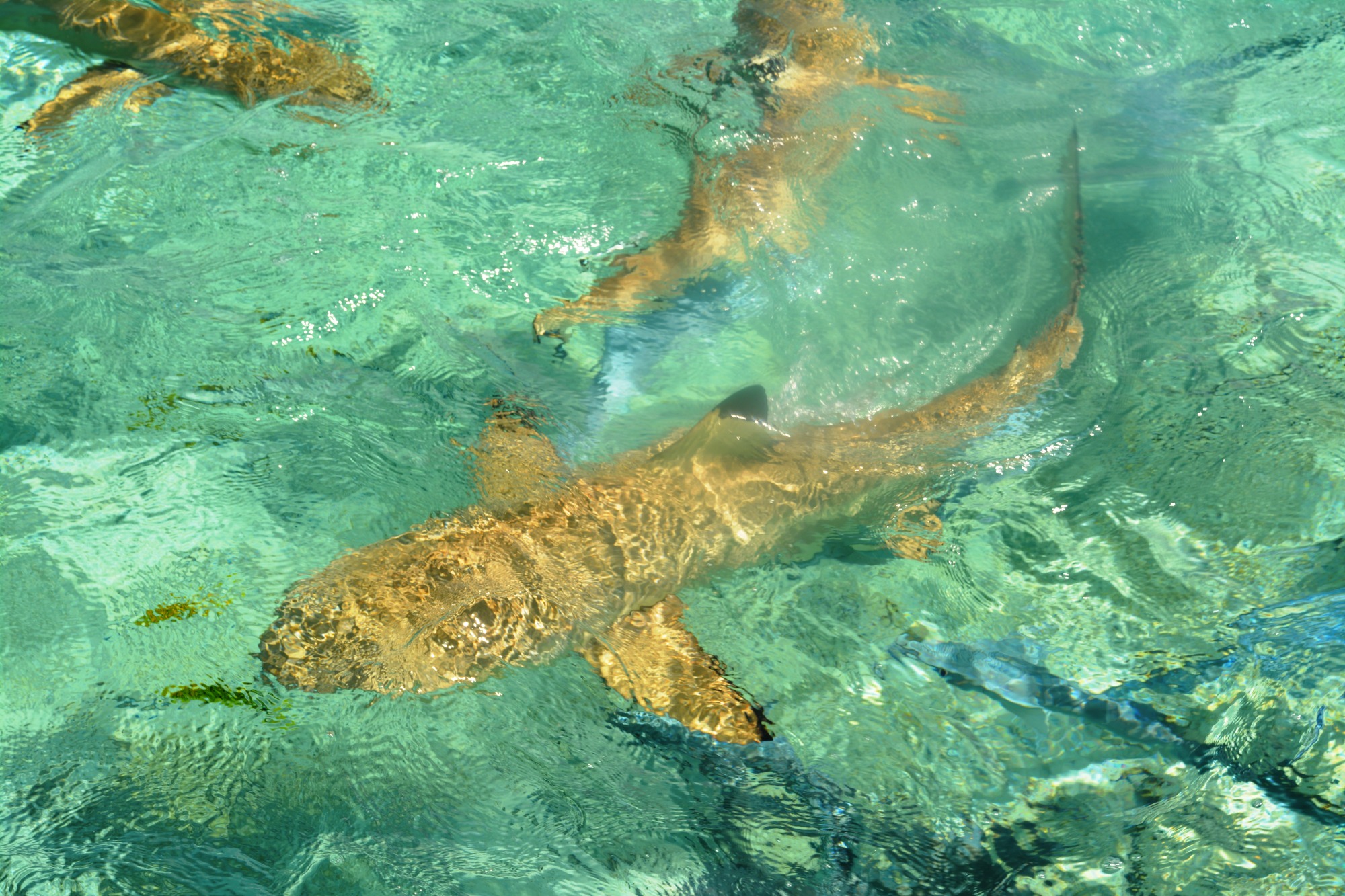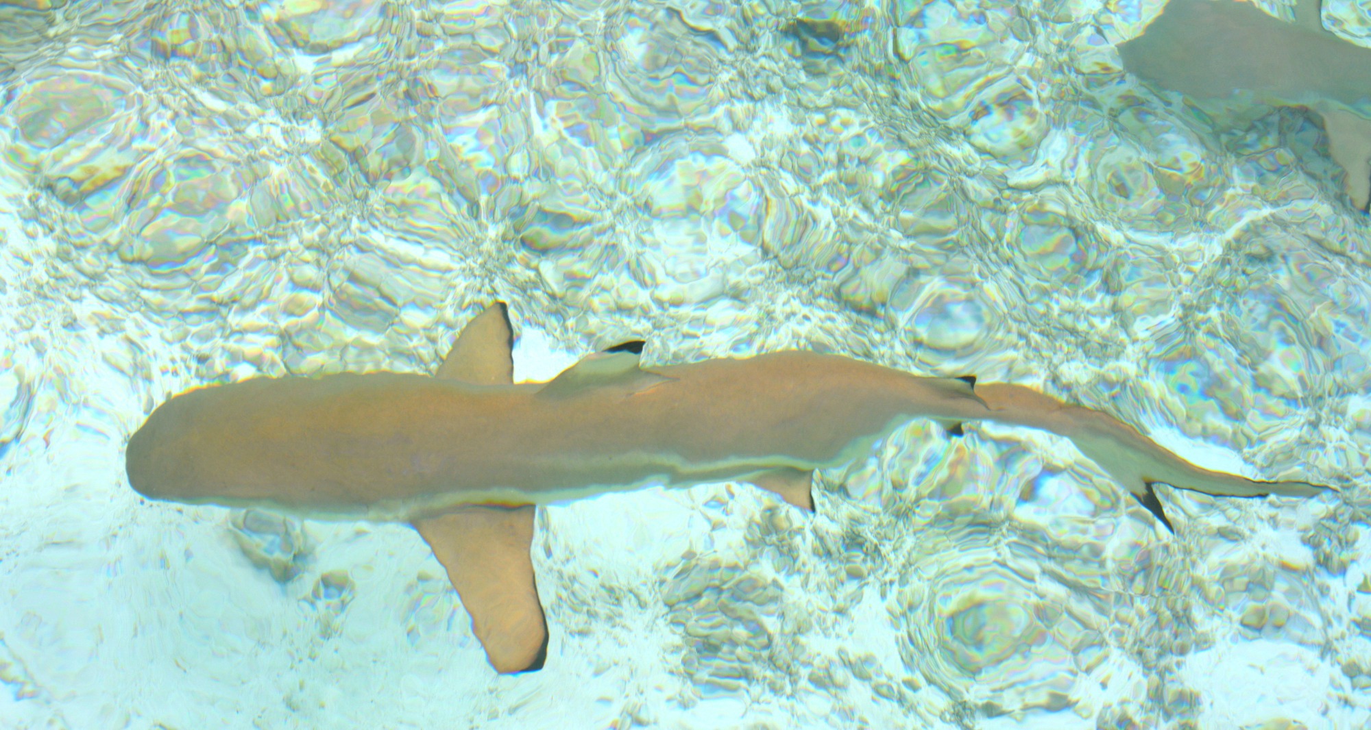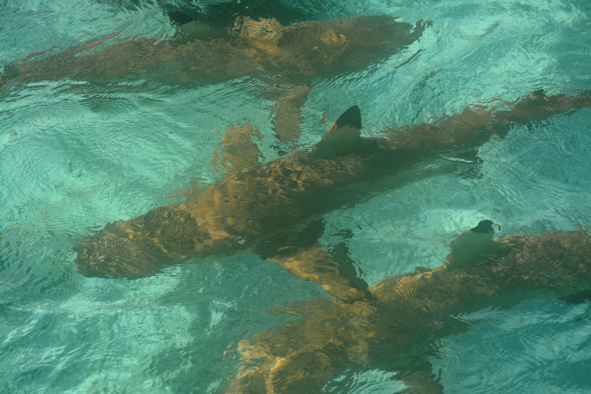 Unser erster Ausflug führt uns in die berühmte „Lagune in der Lagune“ – die Blaue Lagune, eine kleine, von Palmen eingerahmte Lagune innerhalb der großen Lagune von Rangiroa. Das Wasser ist kristallklar, und direkt beim Einstieg vom flachen Sandboden erleben wir junge Schwarzspitzen-Riffhaie. Sie sind ungefährlich, doch wenn man mitten in einen Schwarm hineinschwimmt oder wie in einer Badewanne für Haie hineingeht, kribbelt es schon ordentlich. Begleitet werden wir von bunten Fischen, kleinen Rochen und farbenprächtigen Korallen – ein idyllisches Schnorchelparadies, dass man so schnell nicht vergisst. Vom Boot aus erspähen wir auch größere Haie, wie den mächtigen Zitronenhai. Als er mit rund 3,5 m Länge direkt auf mich zu schwimmt, zieht es mich instinktiv zurück aufs Boot – ein Herzklopfen-Moment, der die Wildheit des Ozeans spürbar macht.