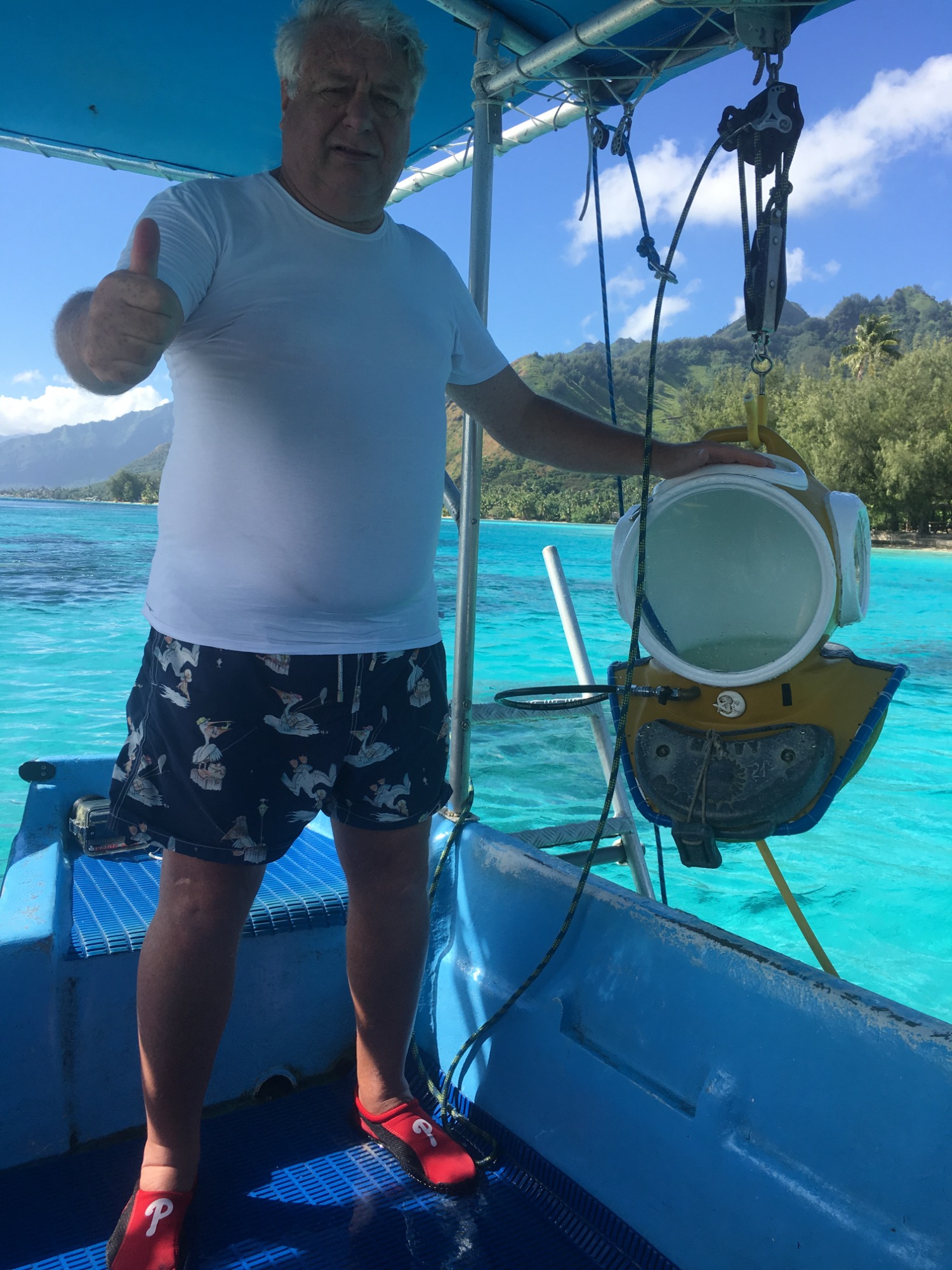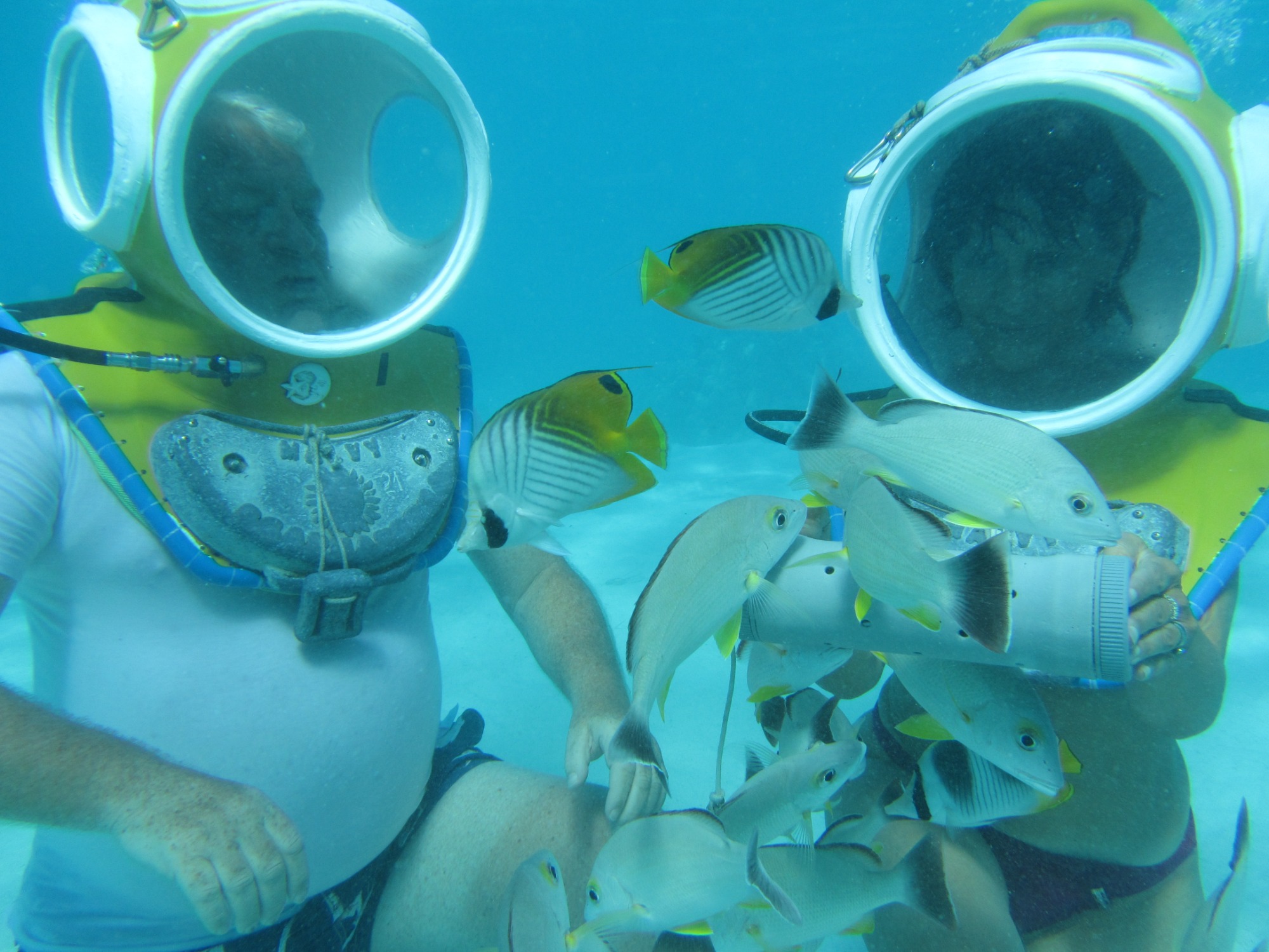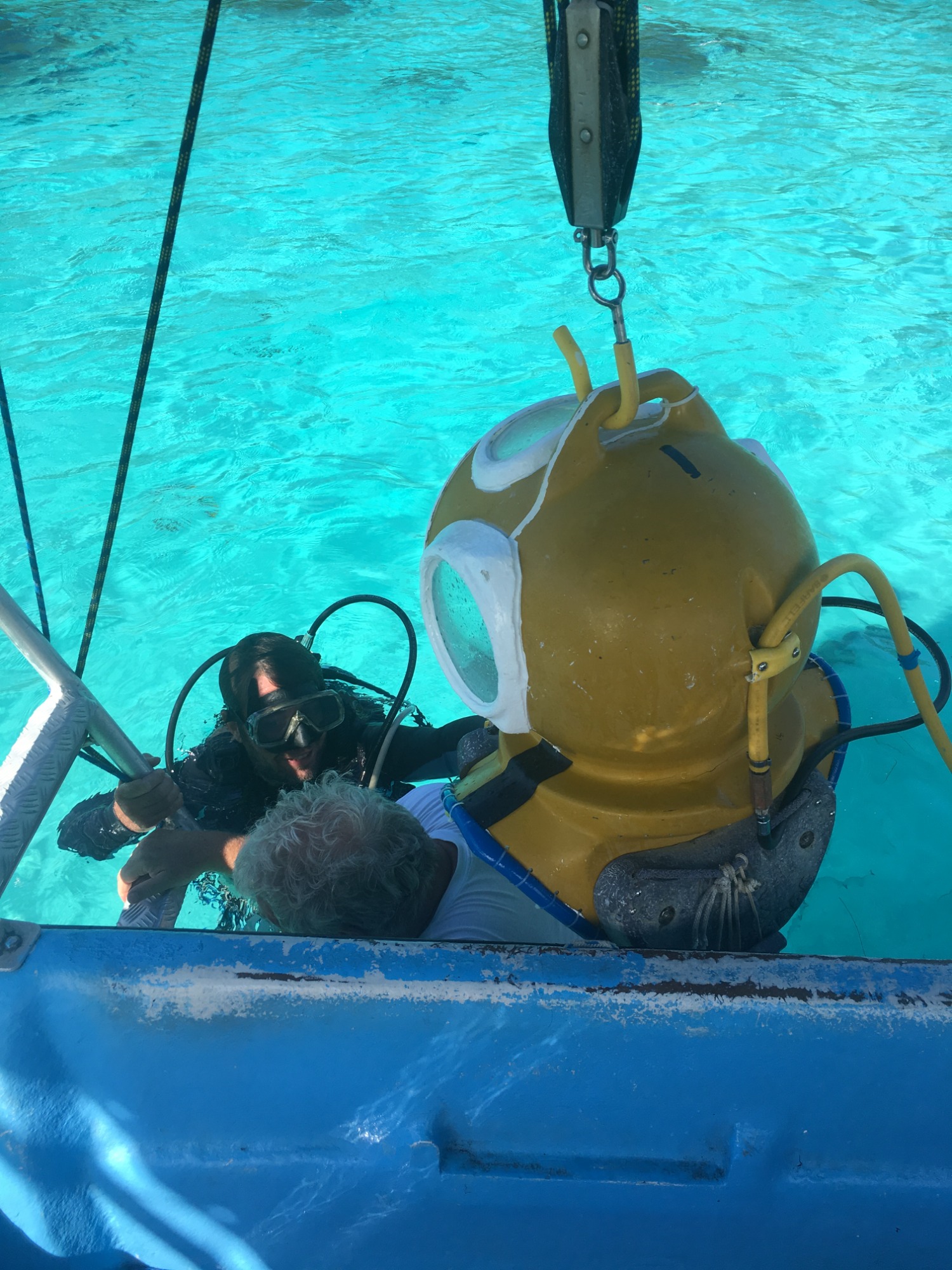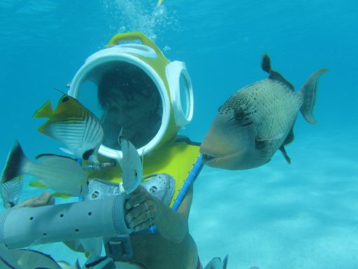 Ein weiterer Höhepunkt wartet bei einem weiteren Ausflug uns: Mit einem speziellen Unterwasserhelm tauchen wir bis fünf Meter tief. Wir gehen auf Tuchfühlung mit der Unterwasserwelt, atmen ganz natürlich und wandeln zwischen bunten Fischen und Korallenriffen – ein stiller Tanz mit der Natur, der uns tief beeindruckt.