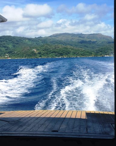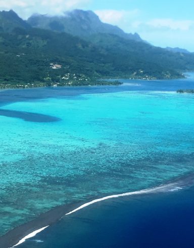 Von Papeete auf der Insel Tahiti reisen wir weiter nach Taha’a. Die Anreise erfolgt über die Nachbarinsel Raiatea, da Taha’a keinen eigenen Flughafen besitzt. Mehrmals täglich starten Inlandsflüge von Papeete nach Raiatea – der Flug über die türkisfarbene Lagune und die grünen Bergketten der Gesellschaftsinseln dauert nur etwa 45 Minuten.