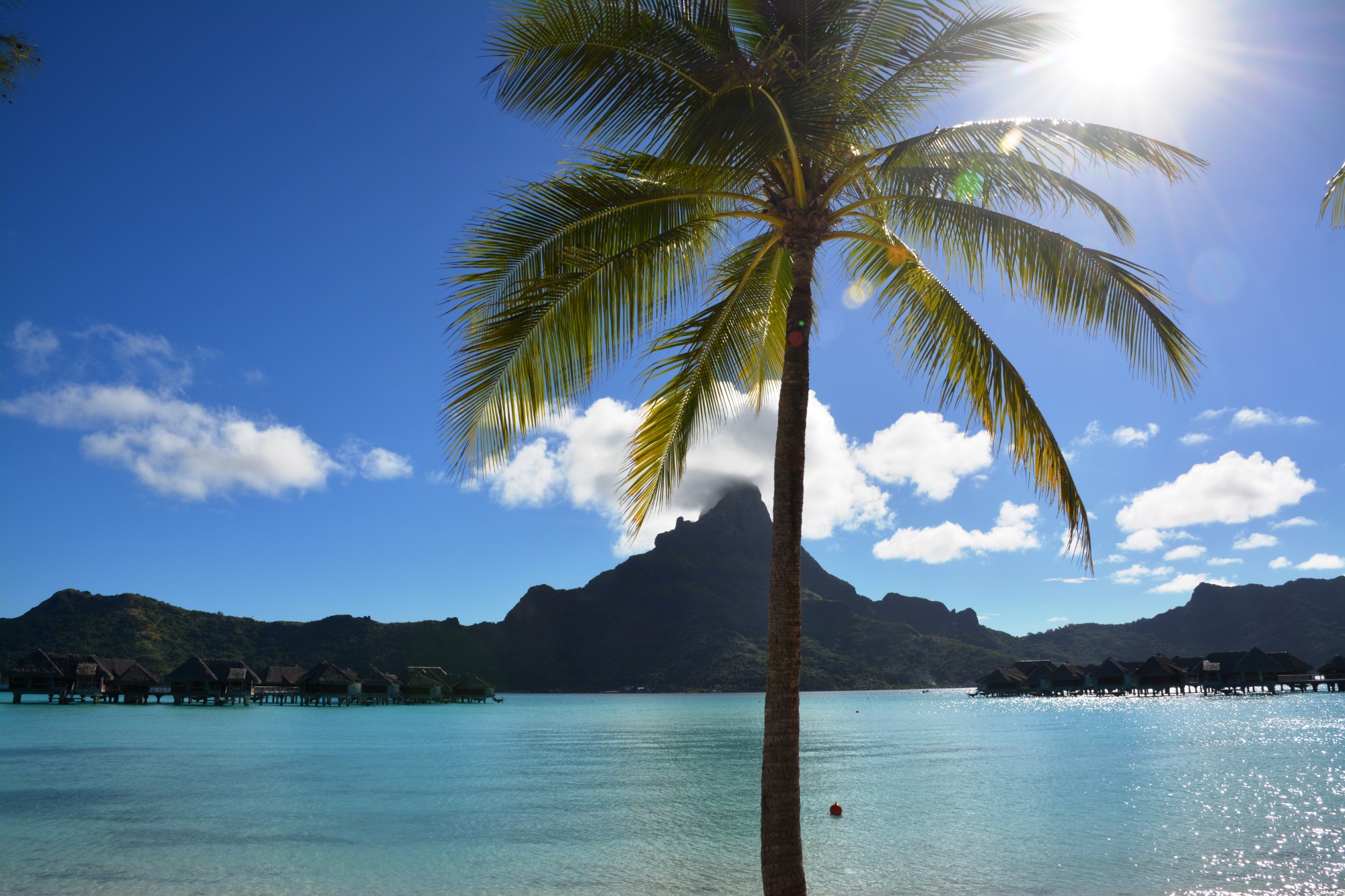 Bora Bora – die Lagune glitzert in schillernden Blautönen, und der Mount Otemanu thront majestätisch darüber.